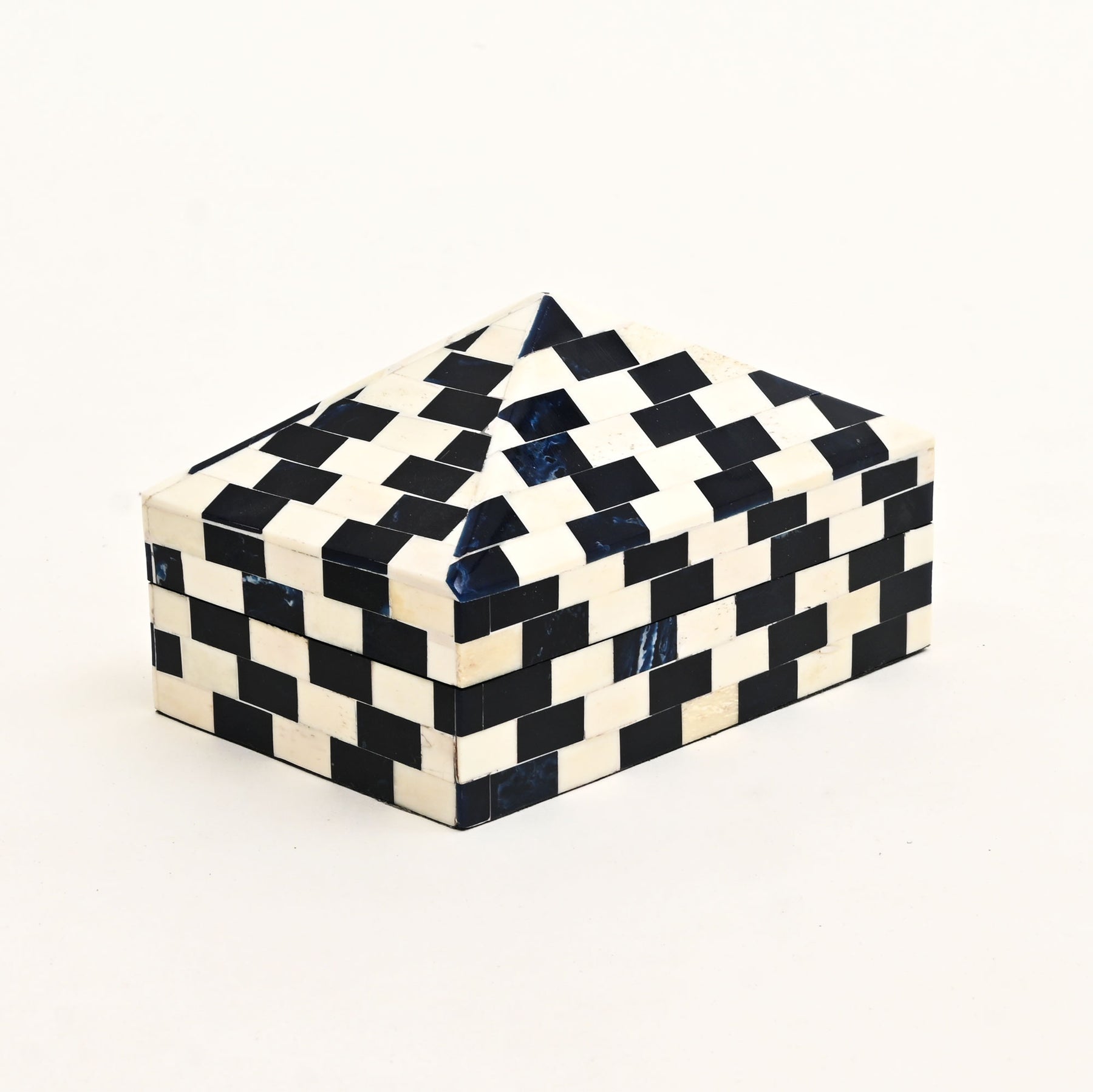 Handcrafted pyramid-shaped box with brick-pattern bone inlay.