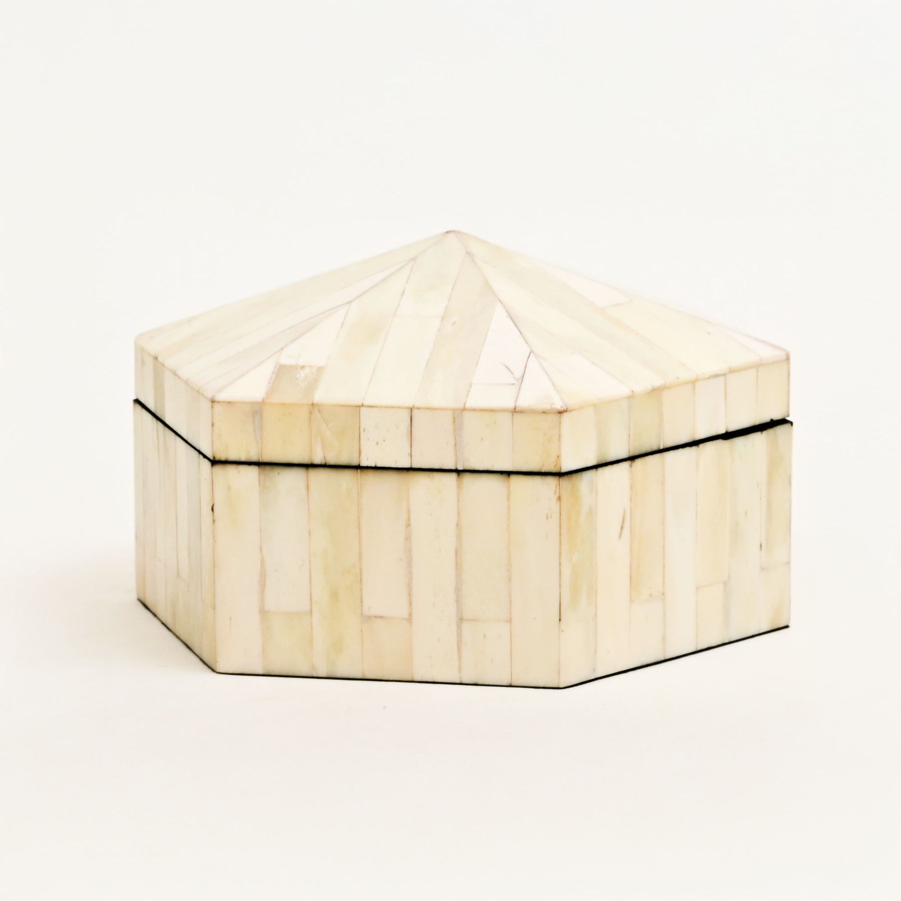 Add artisanal elegance to your home with the Hexagonal Bone Inlay Box Set of 2. Handcrafted by skilled artisans, each box features a delicate hexagonal shape adorned with intricate bone inlay patterns made from ethically sourced materials. The striking design and neutral tones make these boxes ideal for storing jewellery, trinkets, or keepsakes while also serving as decorative accents. Crafted from durable MDF with a precise finish, they look beautiful on shelves, dressers, or tabletops. Combining timeless style with functional storage, this set enhances both modern and traditional interiors with understated charm and craftsmanship.