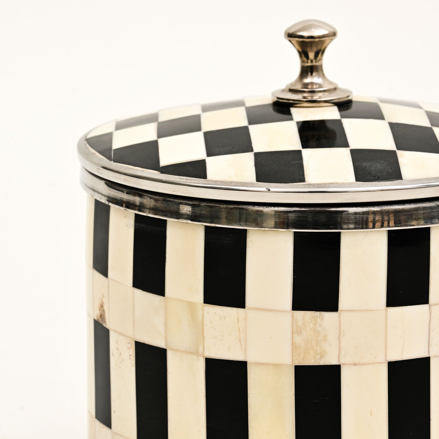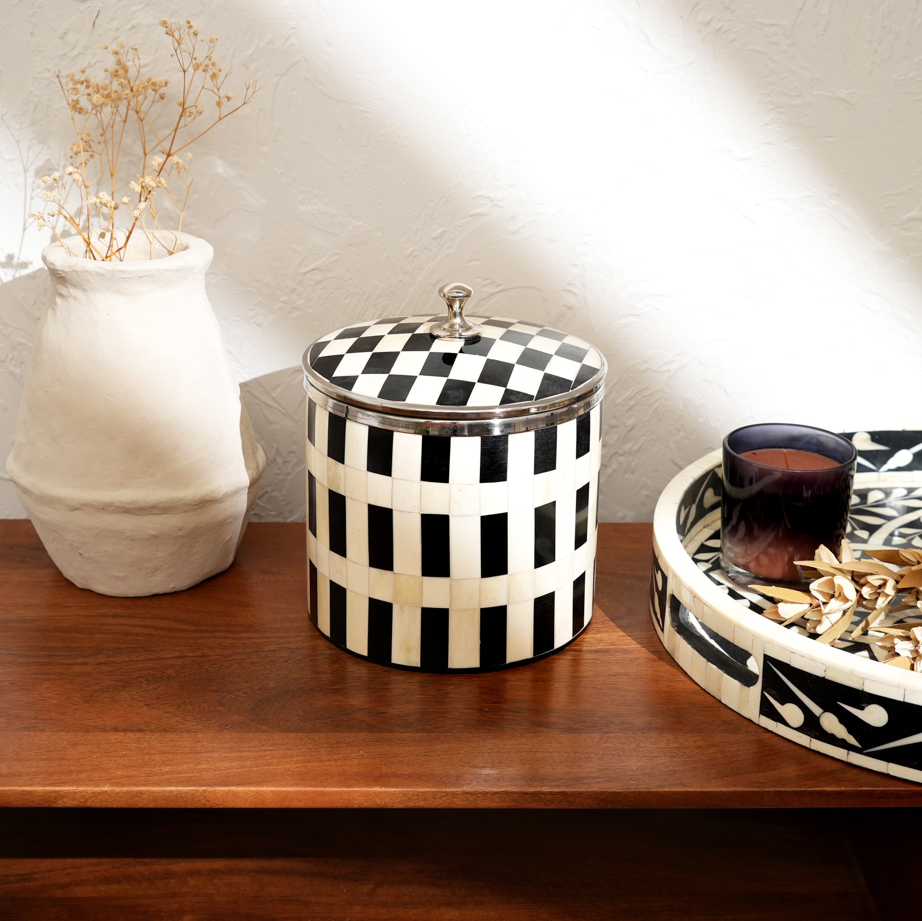 Serve in style with the Checkered Inlay Ice Bucket, a stunning fusion of function and artistry. Handcrafted by skilled artisans, this elegant piece showcases a striking black-and-white checkered design created with ethically sourced bone and resin. Built on a sturdy wooden base with a polished interior, it keeps ice cool for hours, making it perfect for entertaining. A removable lid and easy-to-carry handle add convenience, while its bold design enhances any bar cart or dining setup. Perfect for parties, gatherings, or simply elevating your home décor, this ice bucket is a timeless blend of craftsmanship and sophistication.