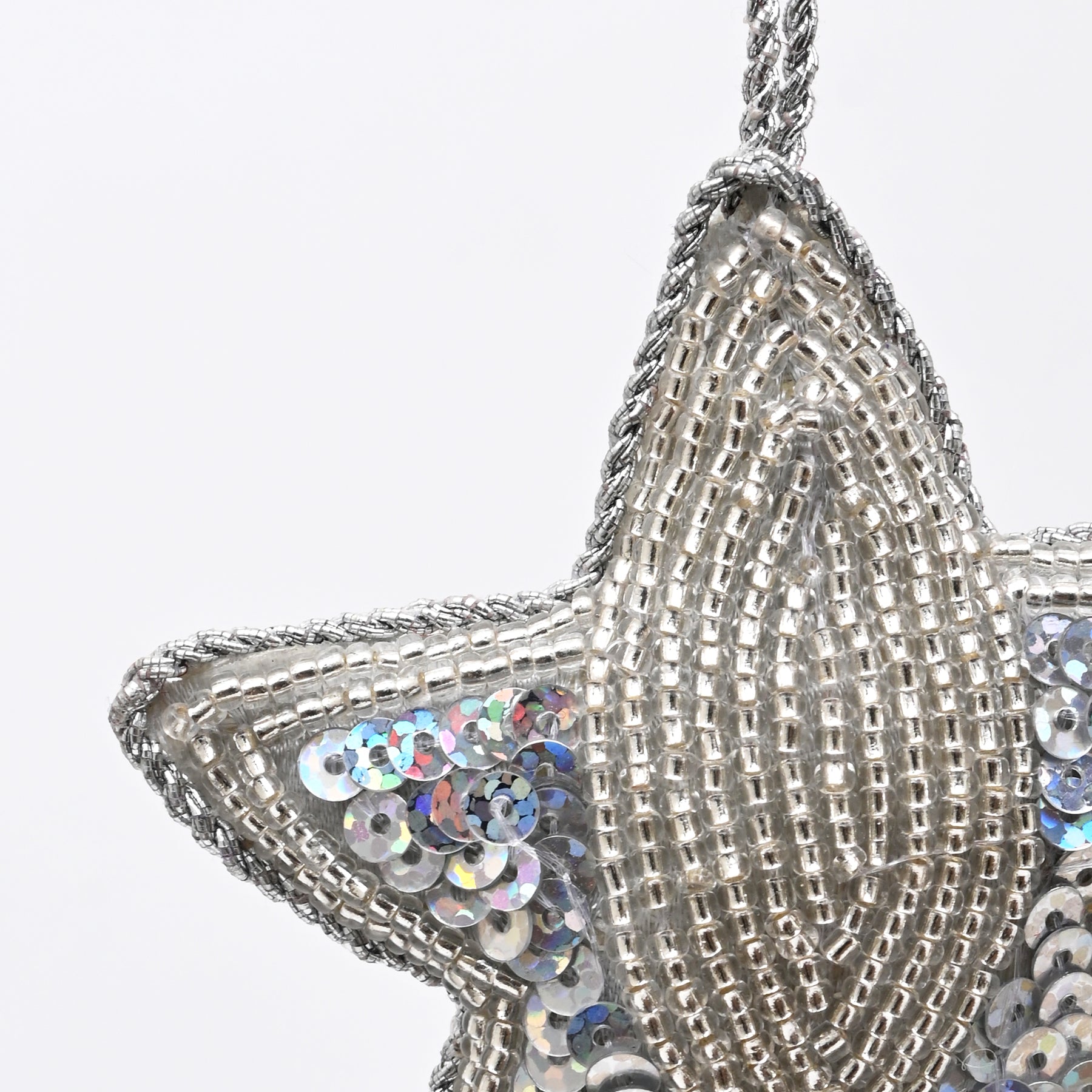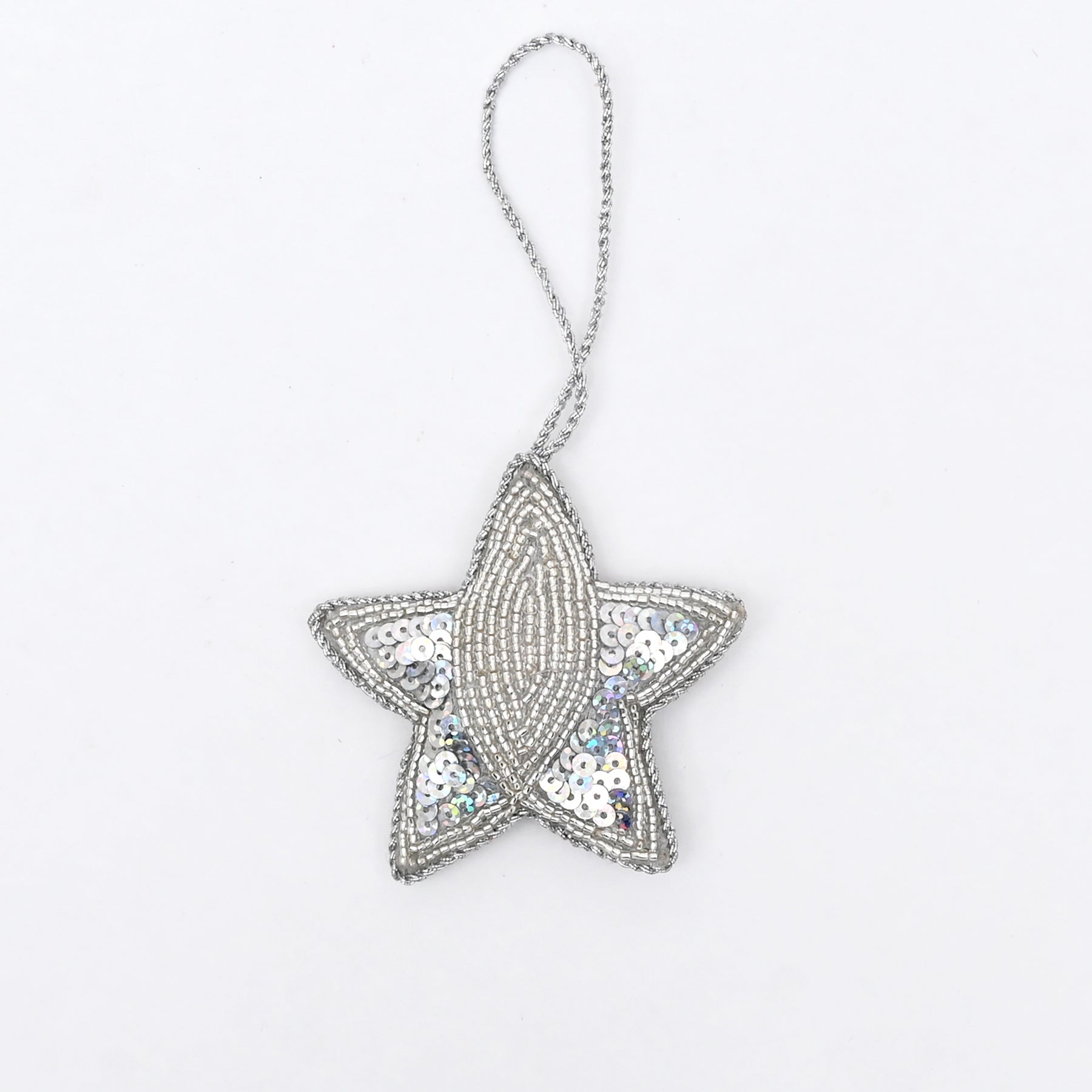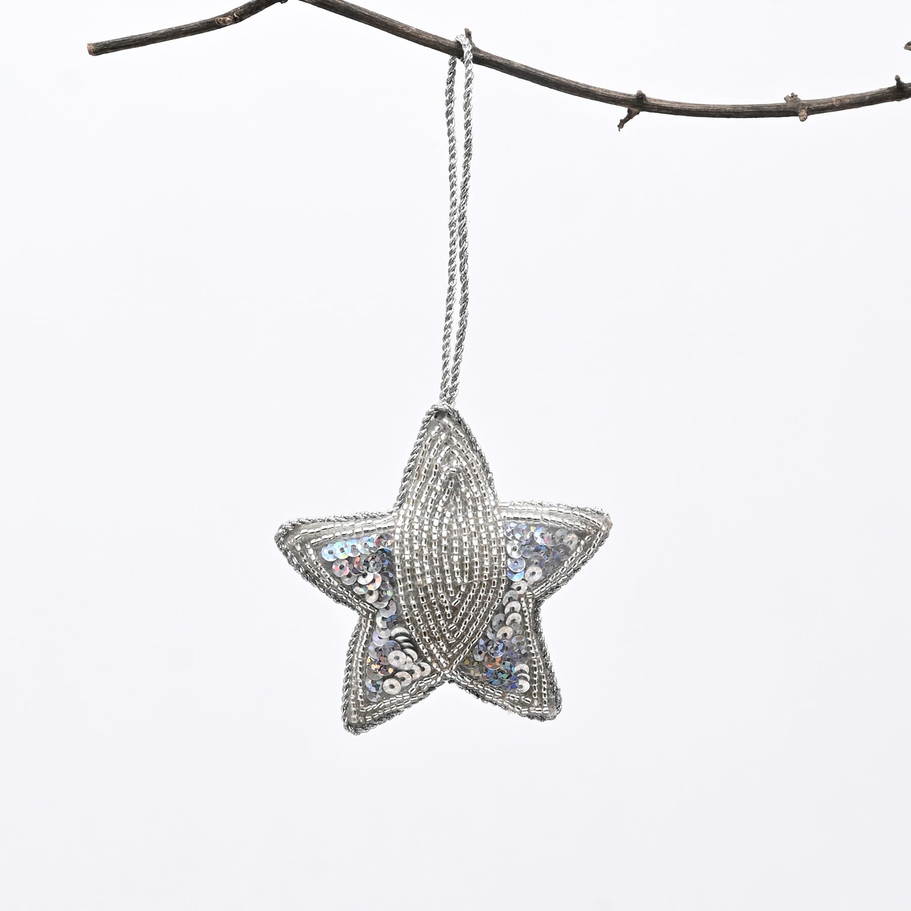 This silver beaded star hanging ornament offers a modern and refined take on festive décor. Crafted with a cotton base and detailed bead accents, it provides texture, shine, and understated elegance.