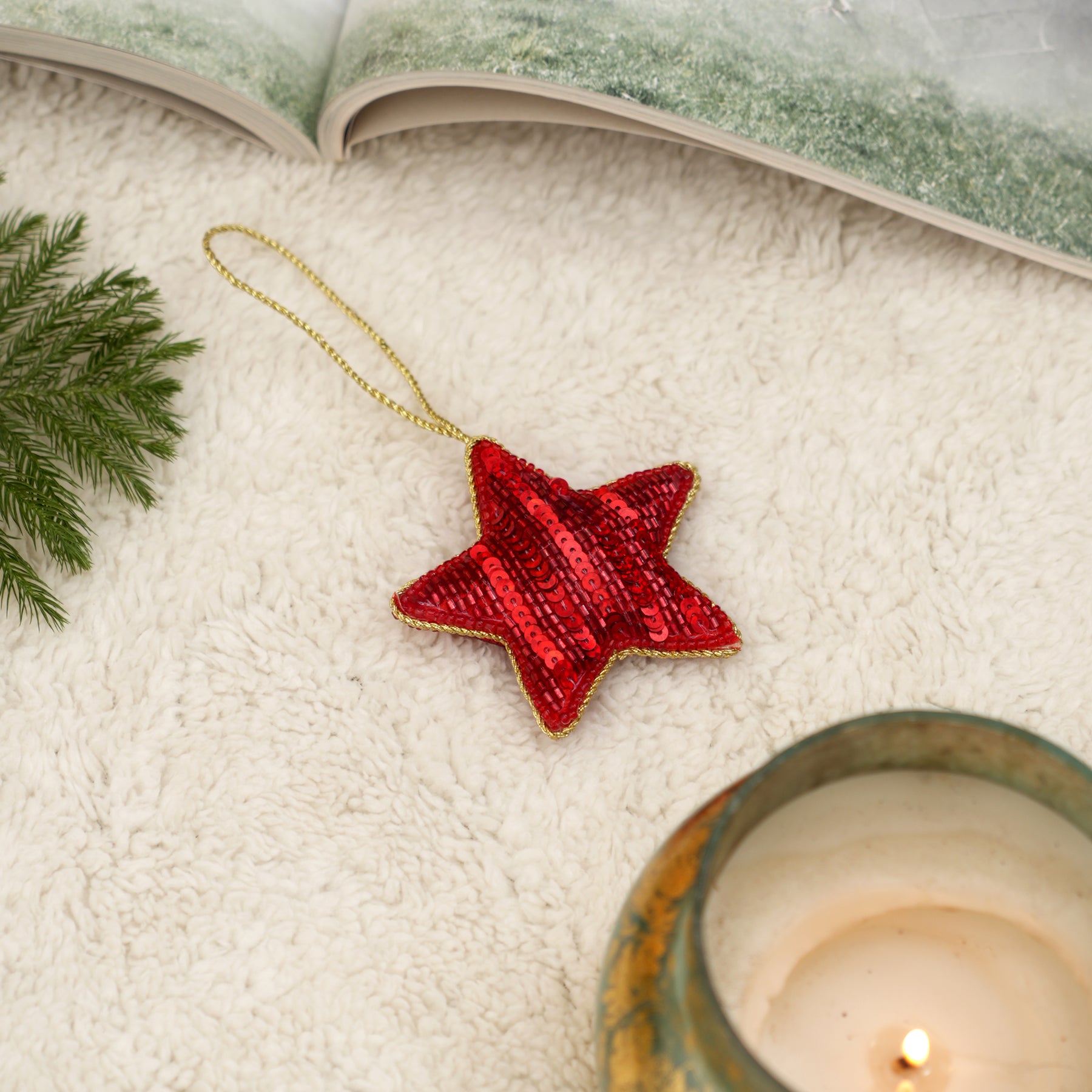 This vibrant red beaded star ornament brings classic Christmas warmth and colour to festive décor. Made from cotton fabric and embellished with detailed beadwork, it creates a rich, textured finish.
