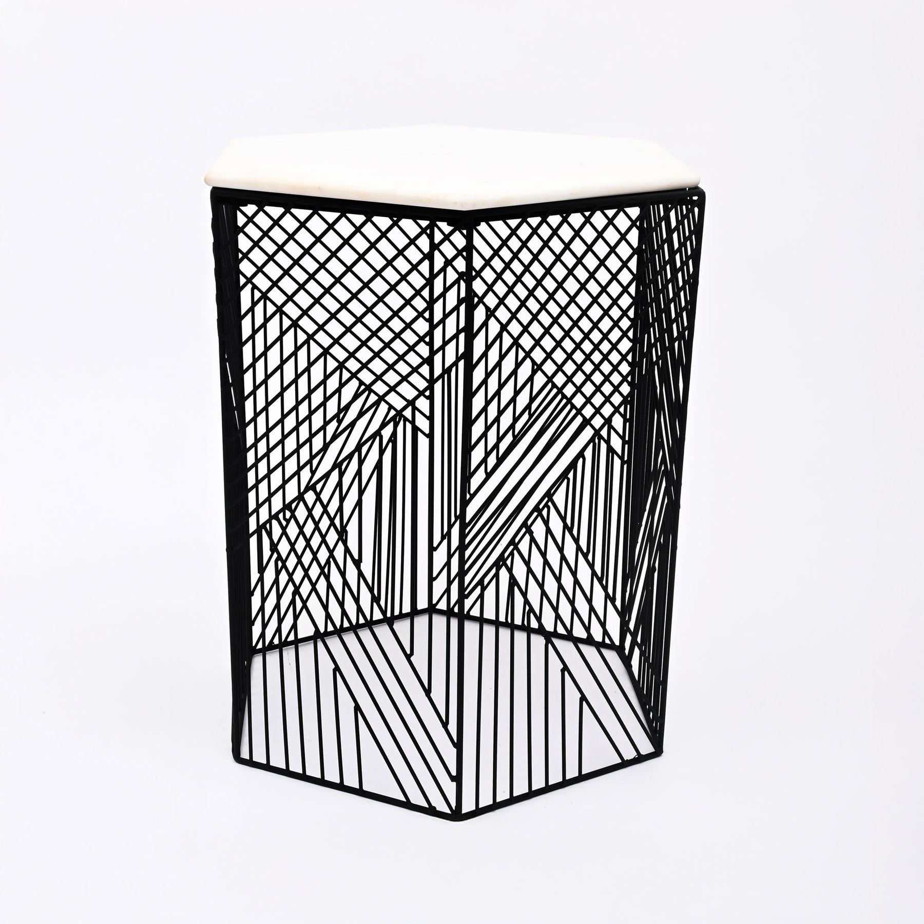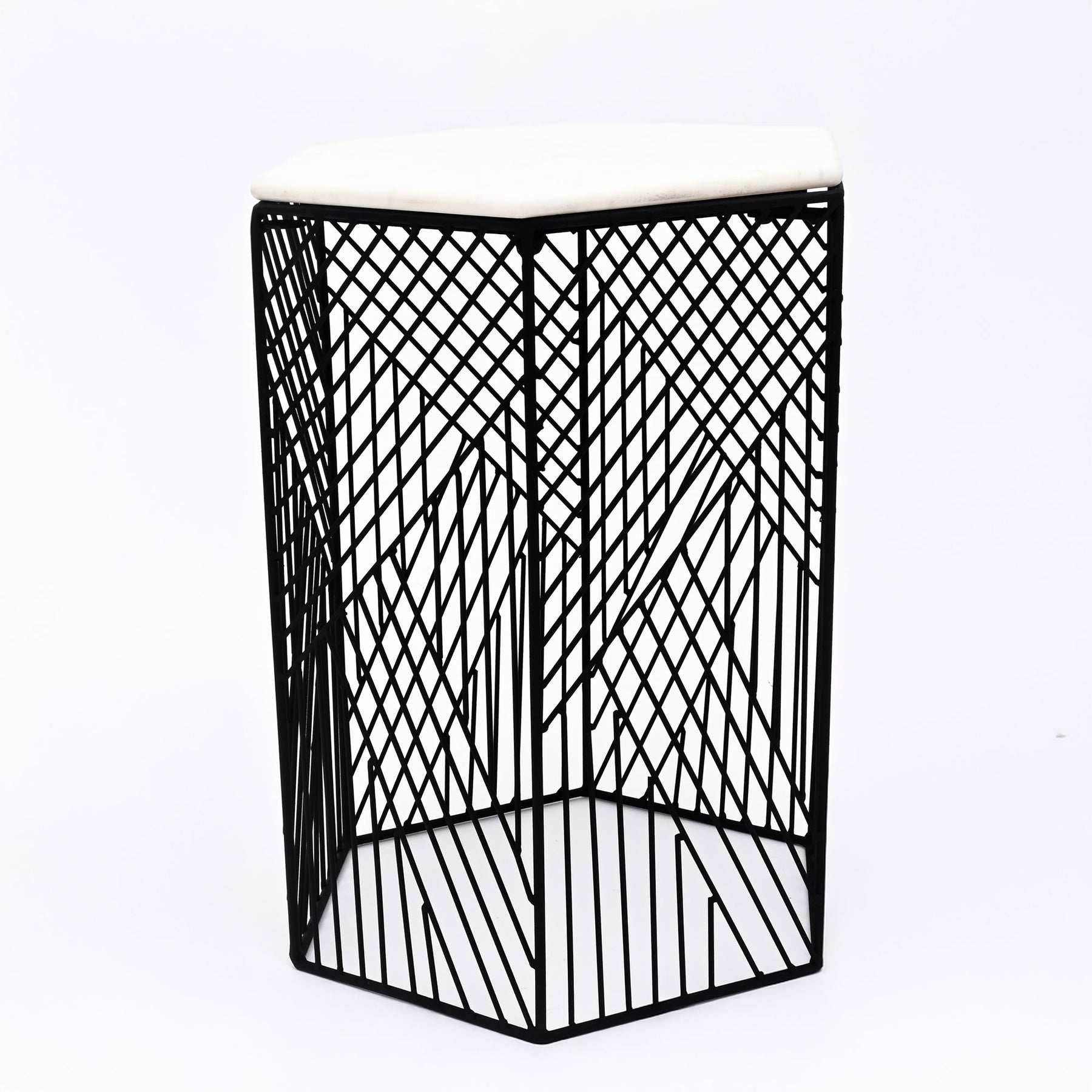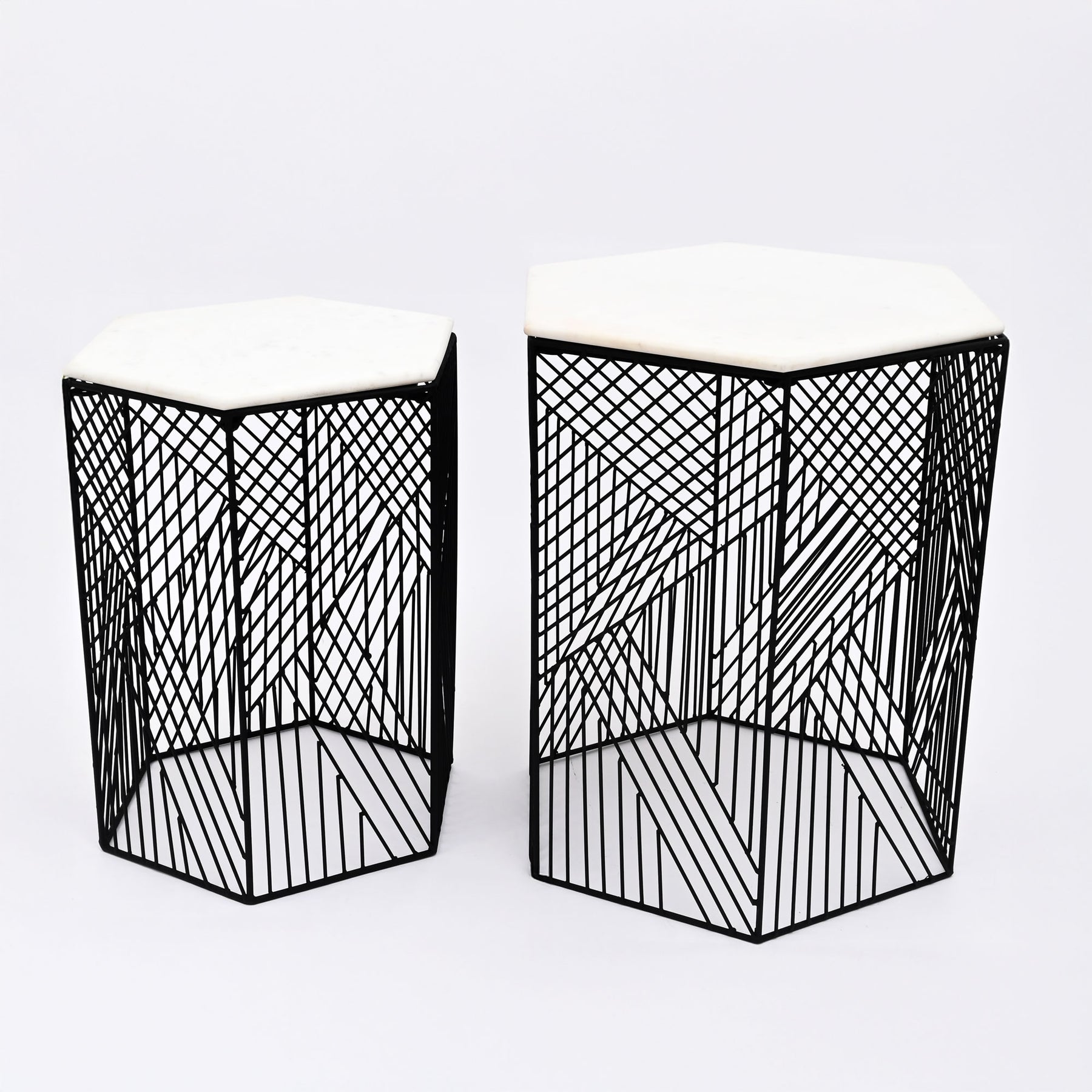 Create a sculptural statement with this Set of 2 Hexagonal Accent Tables, a perfect fusion of artistry and functionality. Each table features a smooth marble top paired with an intricate lattice-pattern iron base finished in textured black, offering European-inspired sophistication. Use the tables together as a nesting pair for a layered look, or display them separately for versatile styling throughout your home. Durable, powder-coated frames ensure long-lasting quality, while the bold geometric design enhances modern, transitional, or traditional interiors. Ideal for living rooms, bedrooms, or hallways, these tables combine practicality with visual appeal.