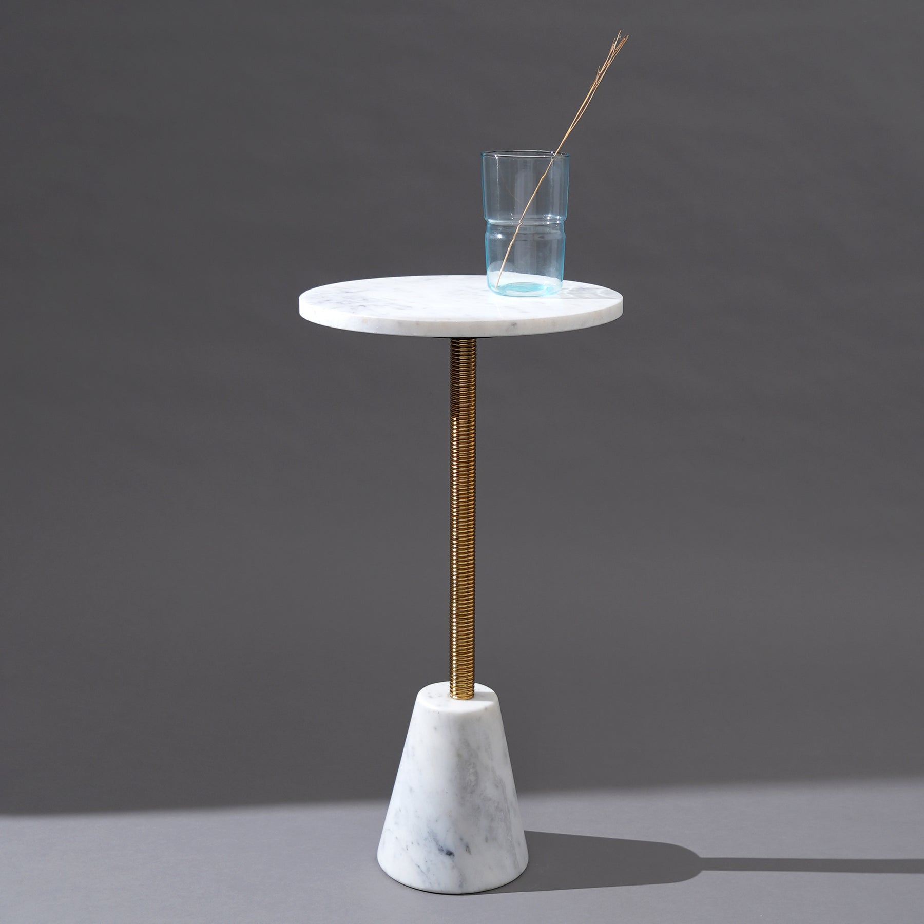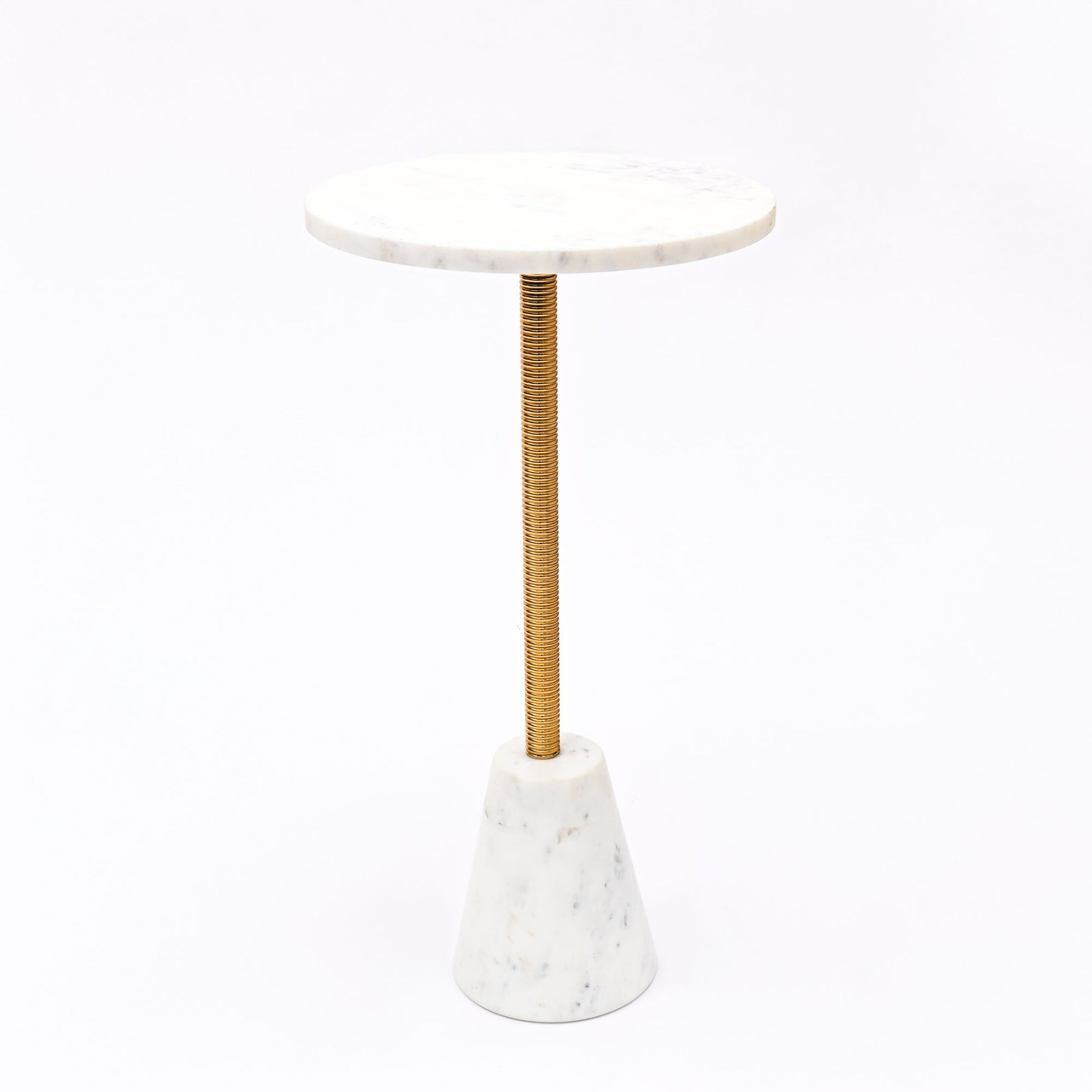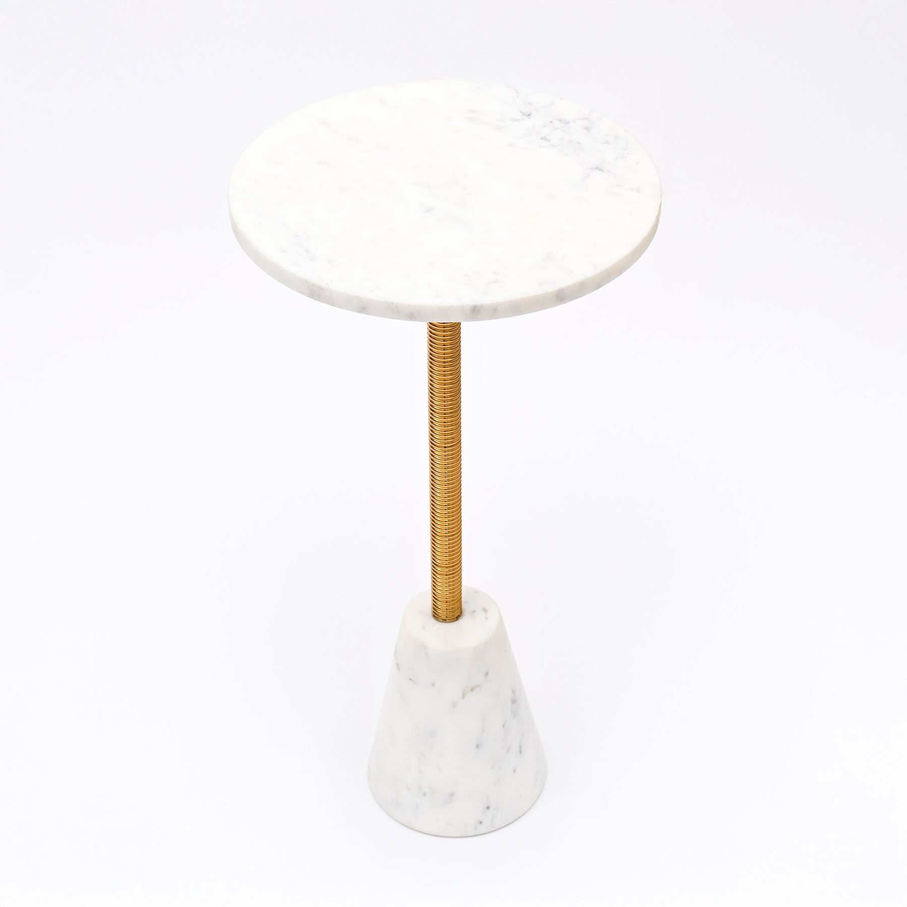 Make a bold statement with this Marble Drink Table, designed to merge sculptural elegance with practical functionality. Its cone-shaped marble base supports a slim, gold-plated iron stem with delicate texturing, topped by a smooth round marble surface. Perfect for holding drinks, vases, or decorative accents, this compact table adds architectural charm to living rooms, entryways, or home bars. Crafted from premium marble and metal, it ensures stability and long-lasting quality. Ideal for modern, eclectic, or classic interiors, this stylish piece brings a refined balance of form and function, transforming any space with subtle sophistication.