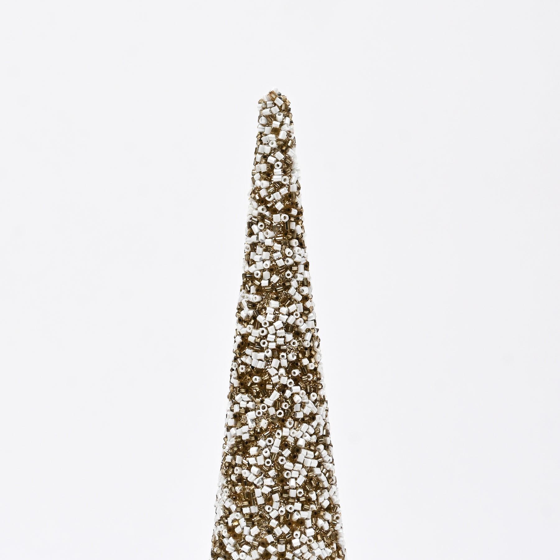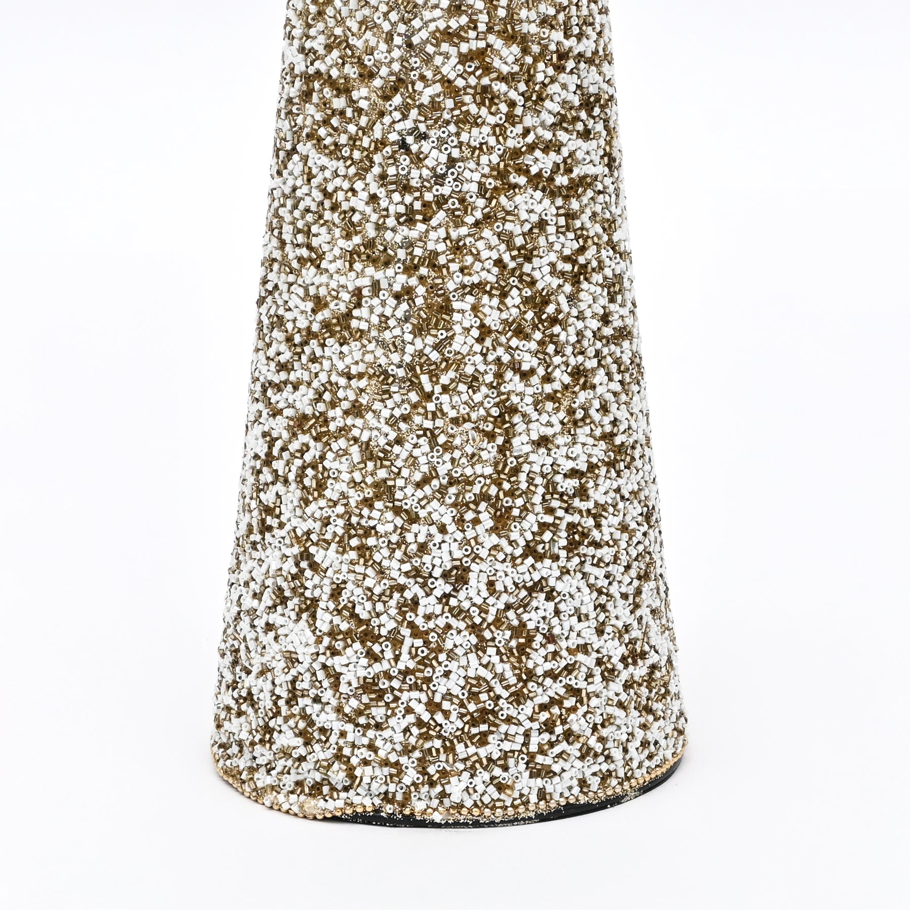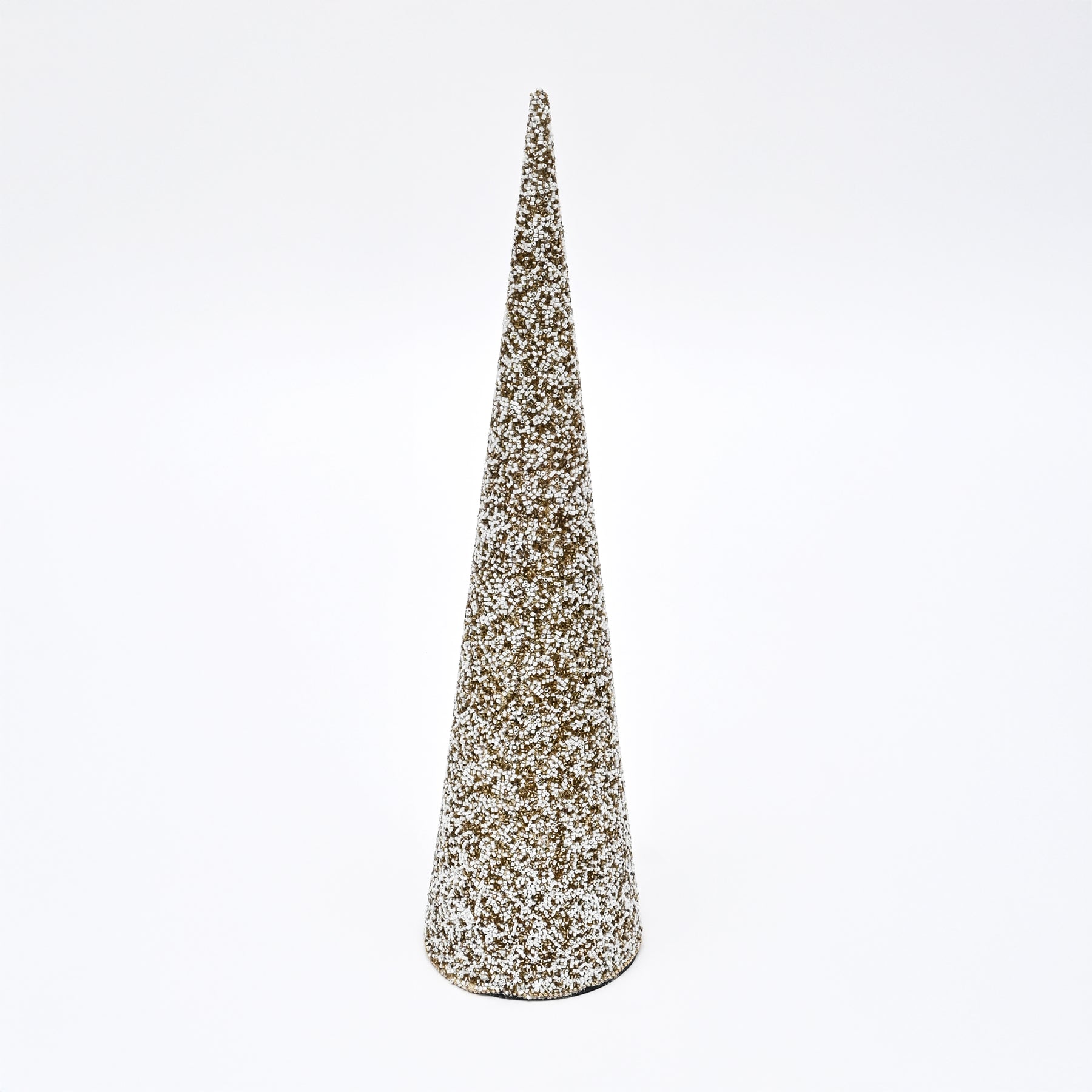 Bring warm, textured elegance to interior styling with this beaded decorative cone. Crafted from a durable plastic base and finished with carefully applied beads in soft gold and natural tones, it adds depth and subtle sparkle to shelves, mantels, and tabletop displays.