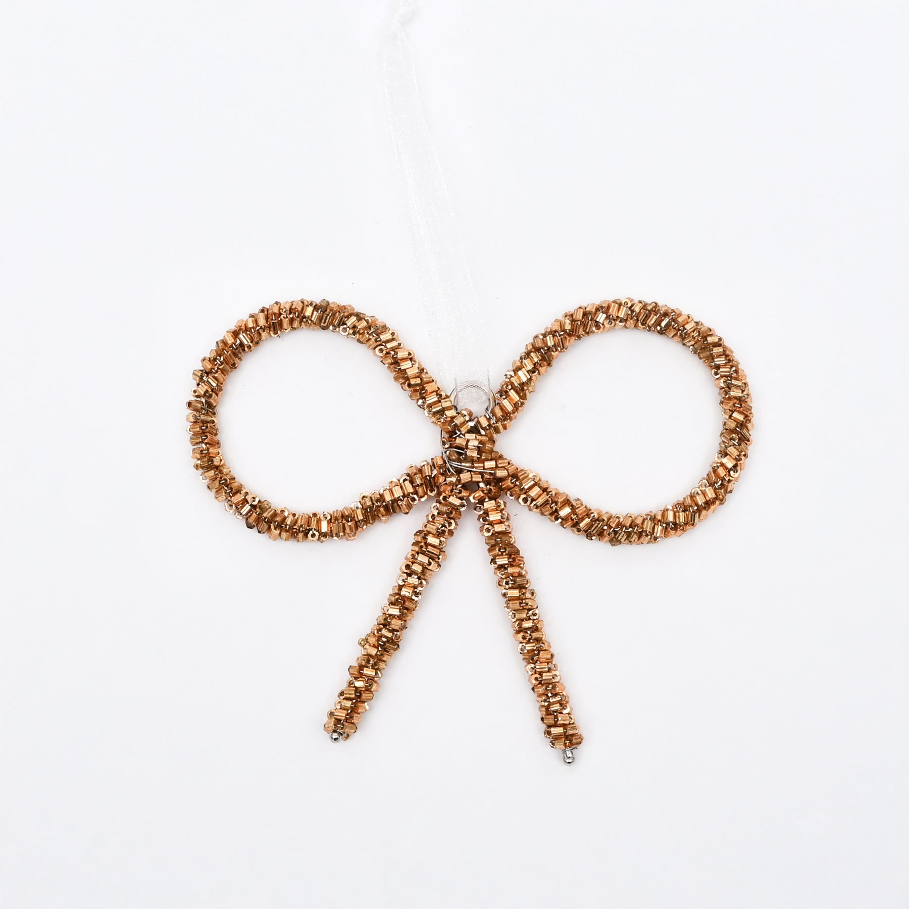 This gold beaded bow hanging ornament adds a touch of elegance and festive warmth to Christmas décor. Crafted from aluminium and delicately embellished with gold beads, it offers a refined sparkle and a handcrafted finish.