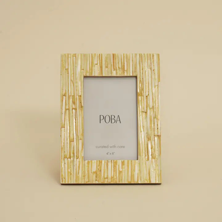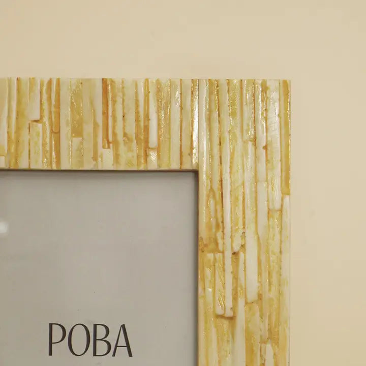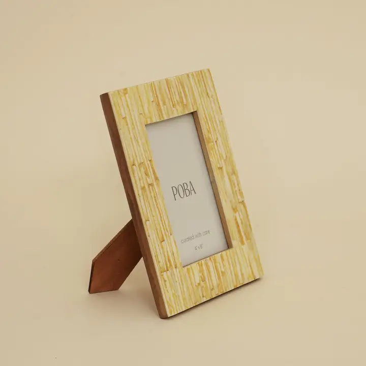 Handgefertigt aus MDF, Harz, Glas und Eisen, verleiht der gelb gestreifte Harz-Fotorahmen Ihrer Fotopräsentation eine lebendige, moderne Note. Der kräftige gelbe Farbton und das dynamische abstrakte Muster bringen zeitgenössisches Flair in jeden Raum.