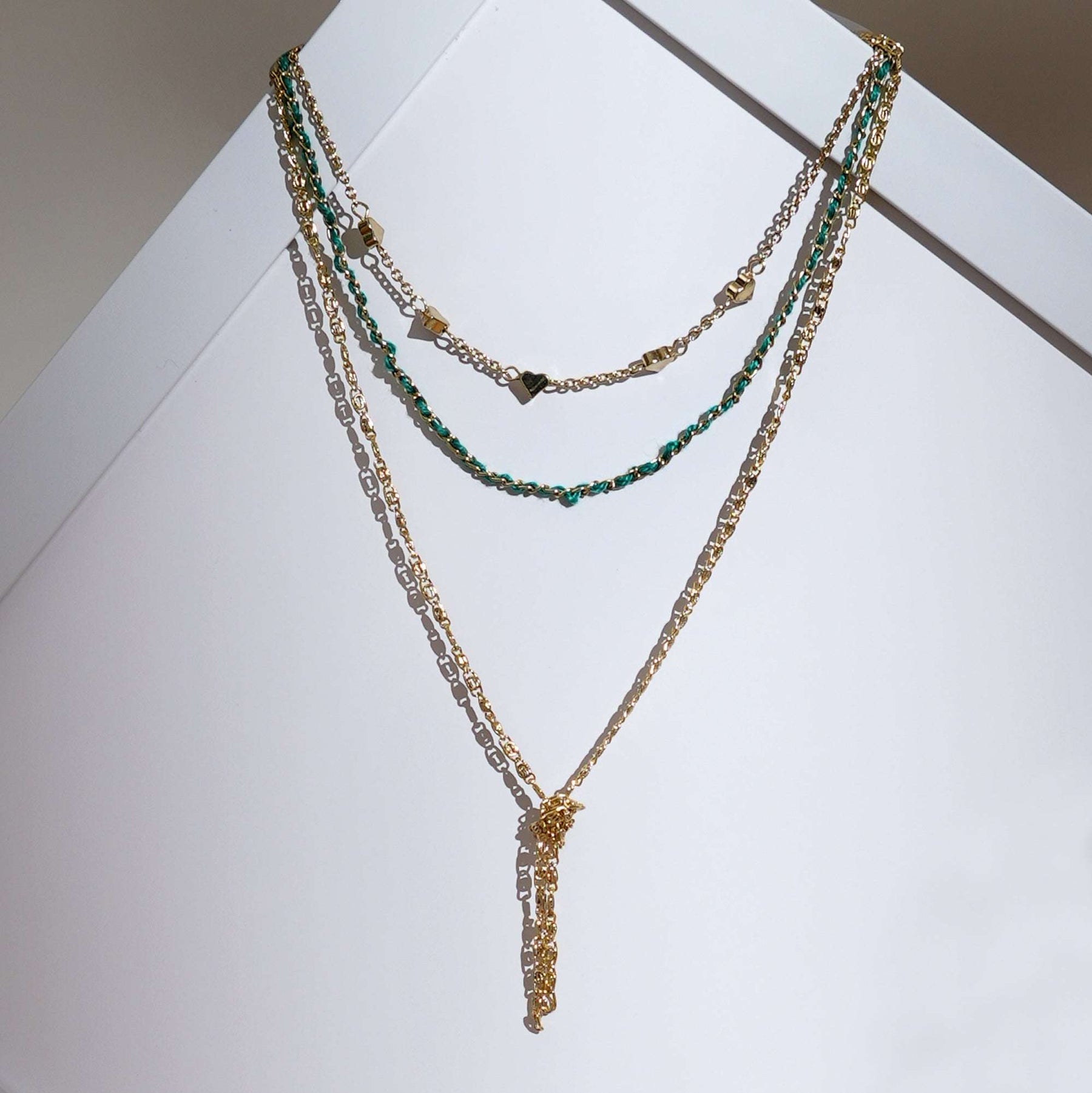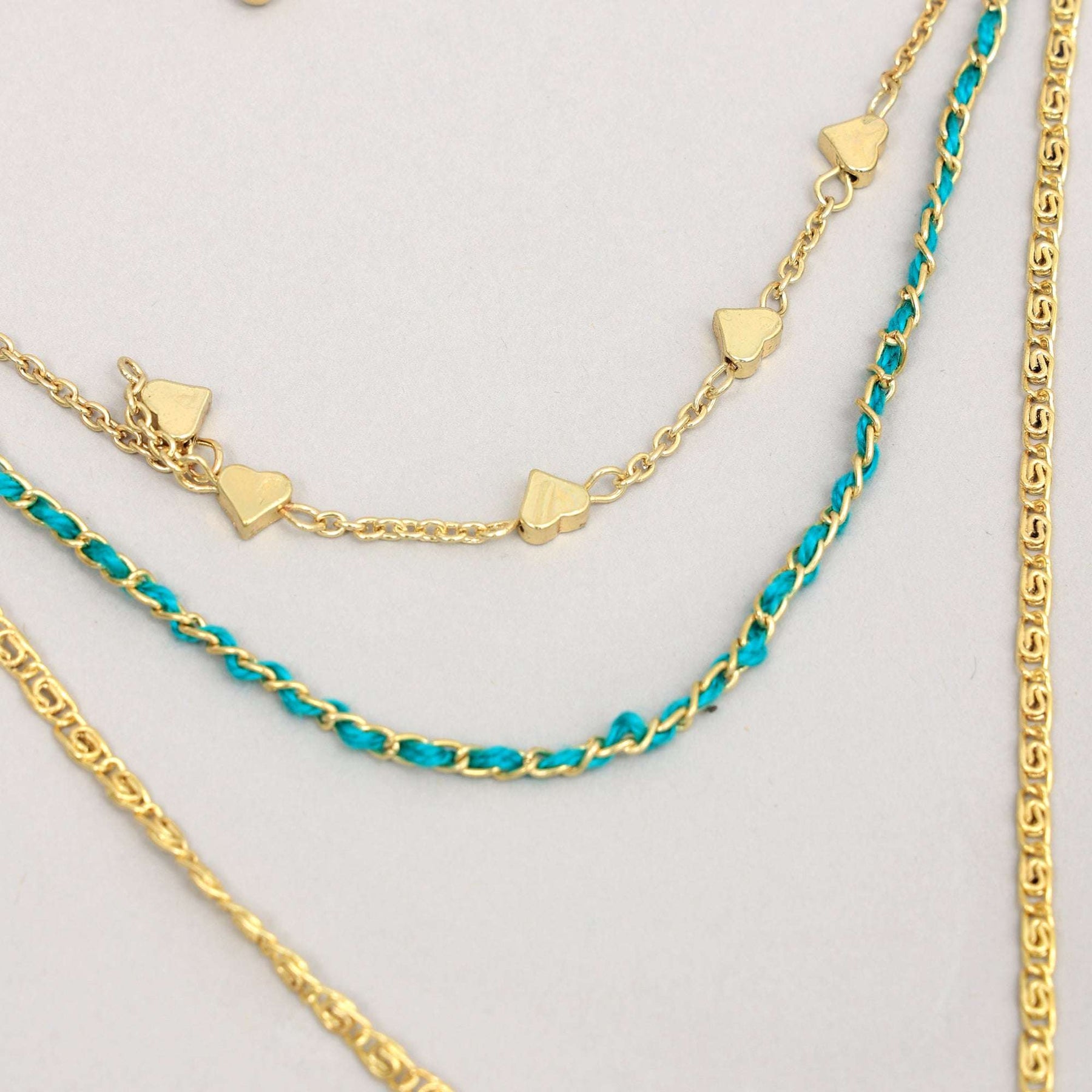 Adopta un estilo bohemio con este collar de capas en tono dorado, que presenta cadenas texturizadas y colgantes únicos para un look relajado y en capas. Fabricado con materiales ligeros y de alta calidad, es perfecto para añadir un toque de elegancia natural a atuendos cotidianos o estilos de festival. Úsalo solo o combínalo con otras piezas para expresar tu estilo individual.