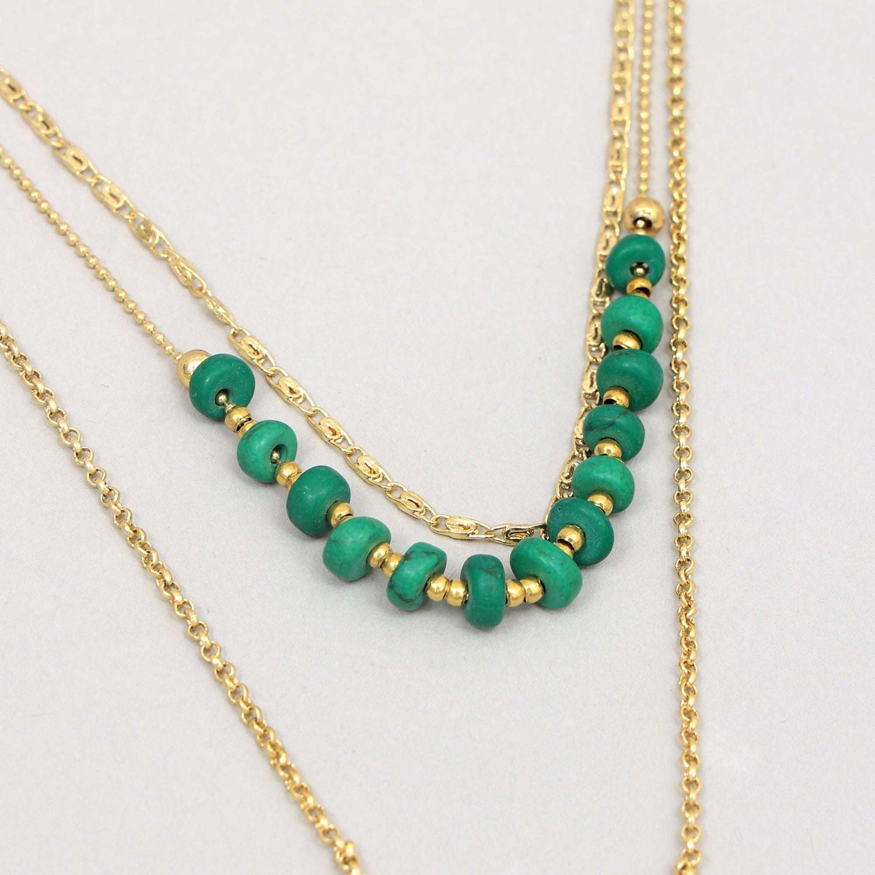 Este collar en capas de tono dorado presenta cadenas delicadas combinadas con acentos de piedra pulida para un look refinado pero natural. Ligero y cómodo, está hecho de materiales hipoalergénicos y diseñado para la comodidad diaria o para ocasiones especiales. Úsalo solo para un encanto sutil o combínalo con otras piezas para un mayor impacto.