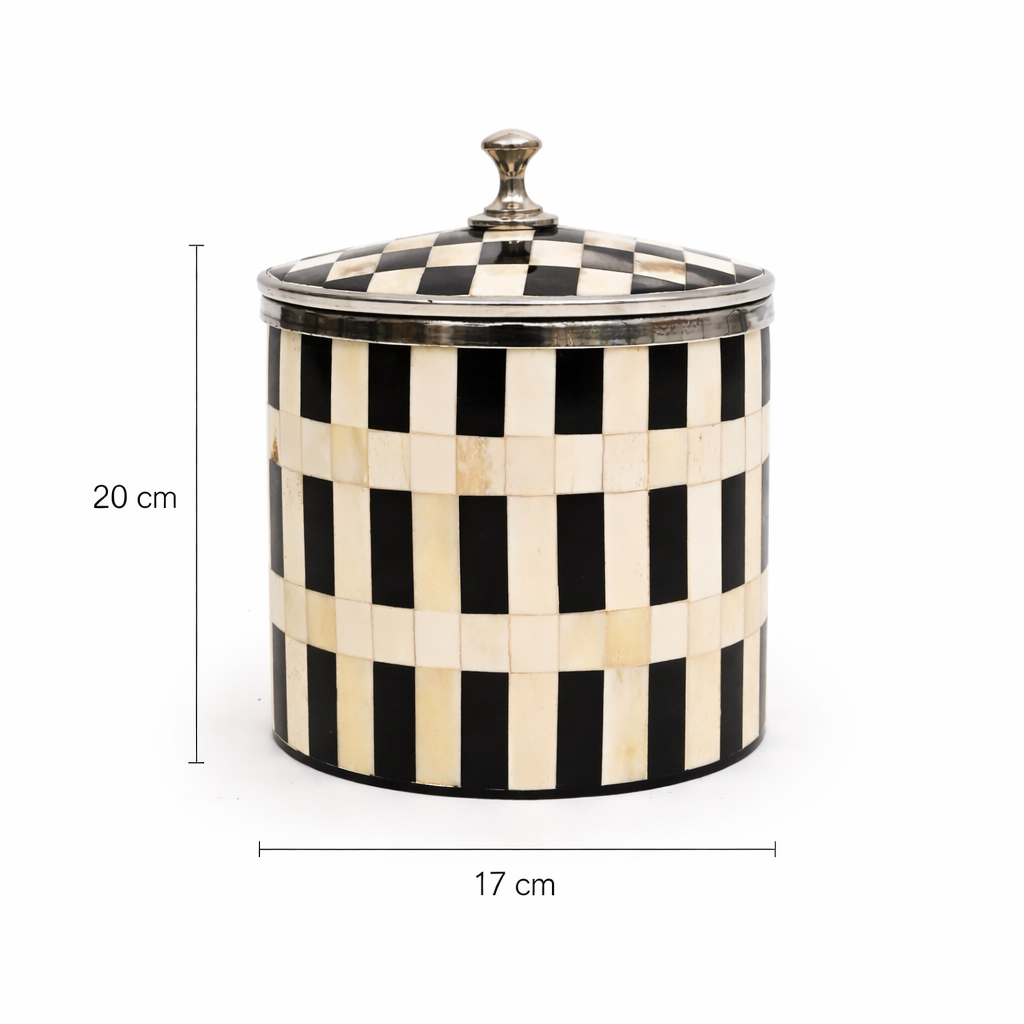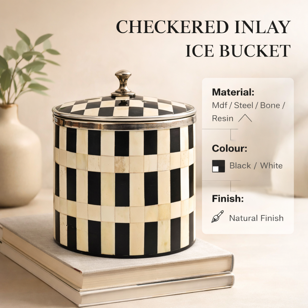 Servez avec style grâce au seau à glace à incrustation à carreaux, une fusion éblouissante de fonction et d'artisanat. Fabriqué à la main par des artisans qualifiés, ce pièce élégante présente un design à carreaux noir et blanc frappant, créé avec de l'os et de la résine issus de sources éthiques. Monté sur une base en bois robuste avec un intérieur poli, il garde la glace fraîche pendant des heures, idéal pour recevoir. Un couvercle amovible et une poignée facile à transporter ajoutent de la commodité, tandis que son design audacieux rehausse n'importe quel chariot de bar ou installation de salle à manger. Parfait pour les fêtes, les réunions ou simplement pour sublimer votre décoration intérieure, ce seau à glace est un mélange intemporel de savoir-faire et de sophistication.