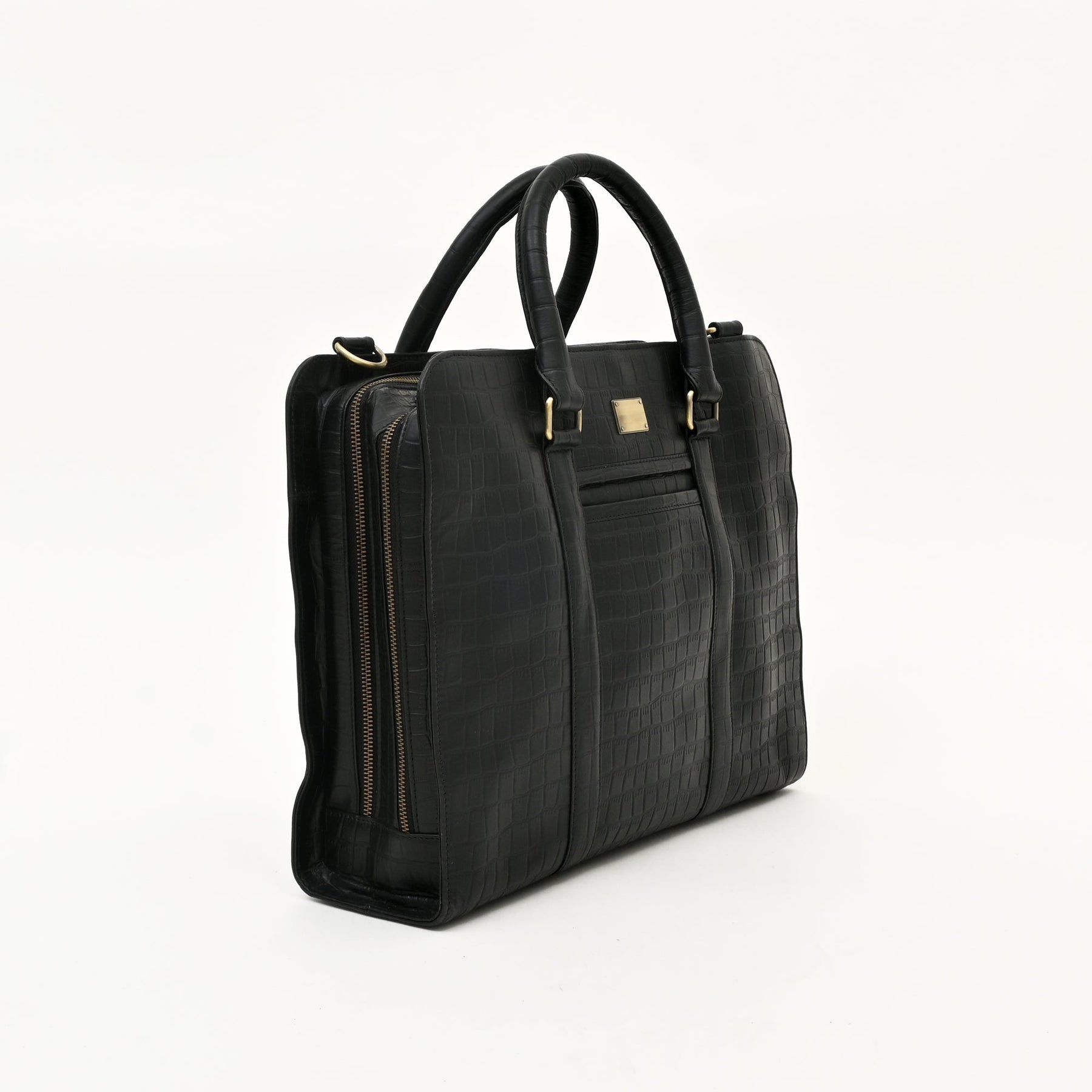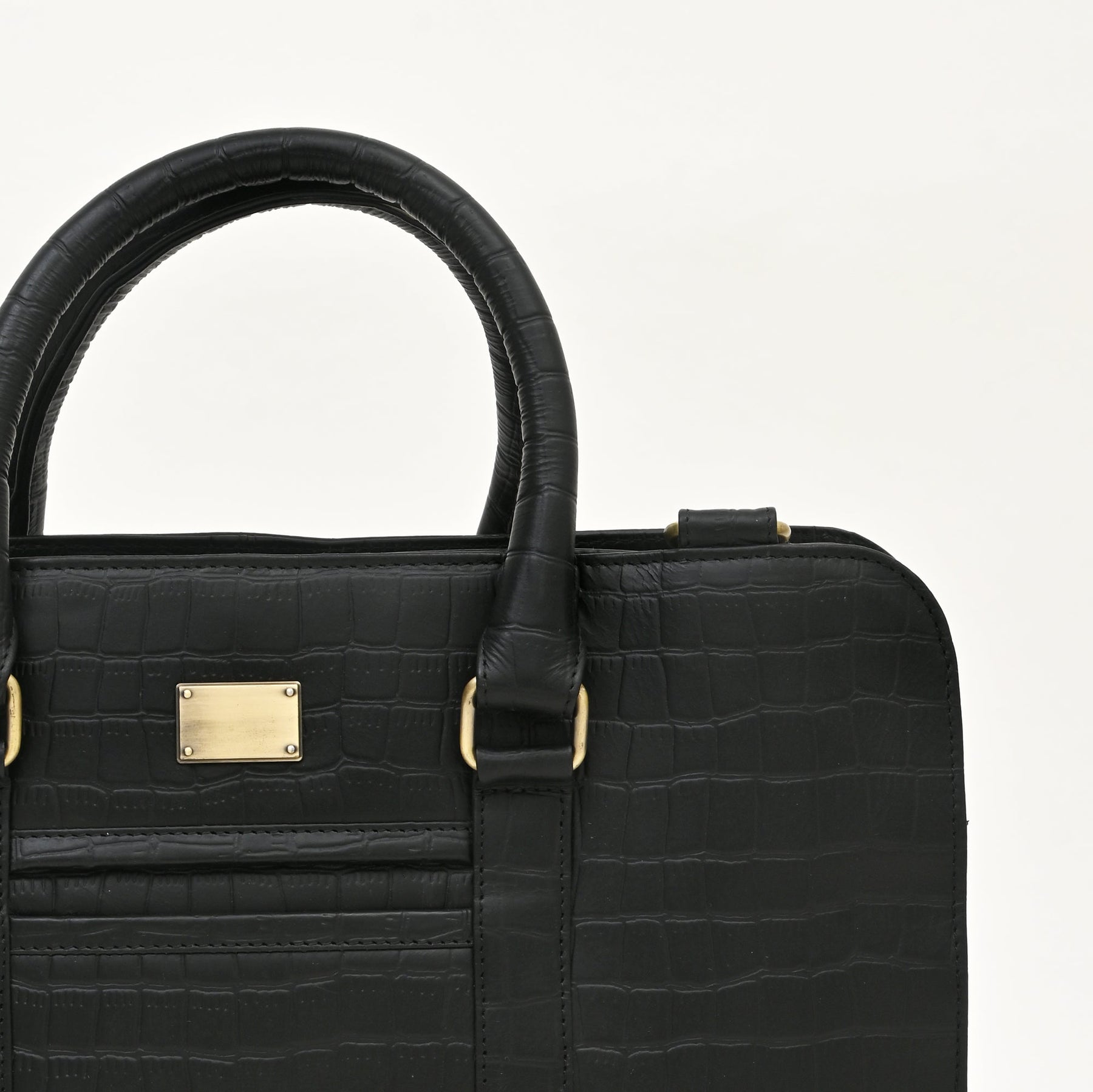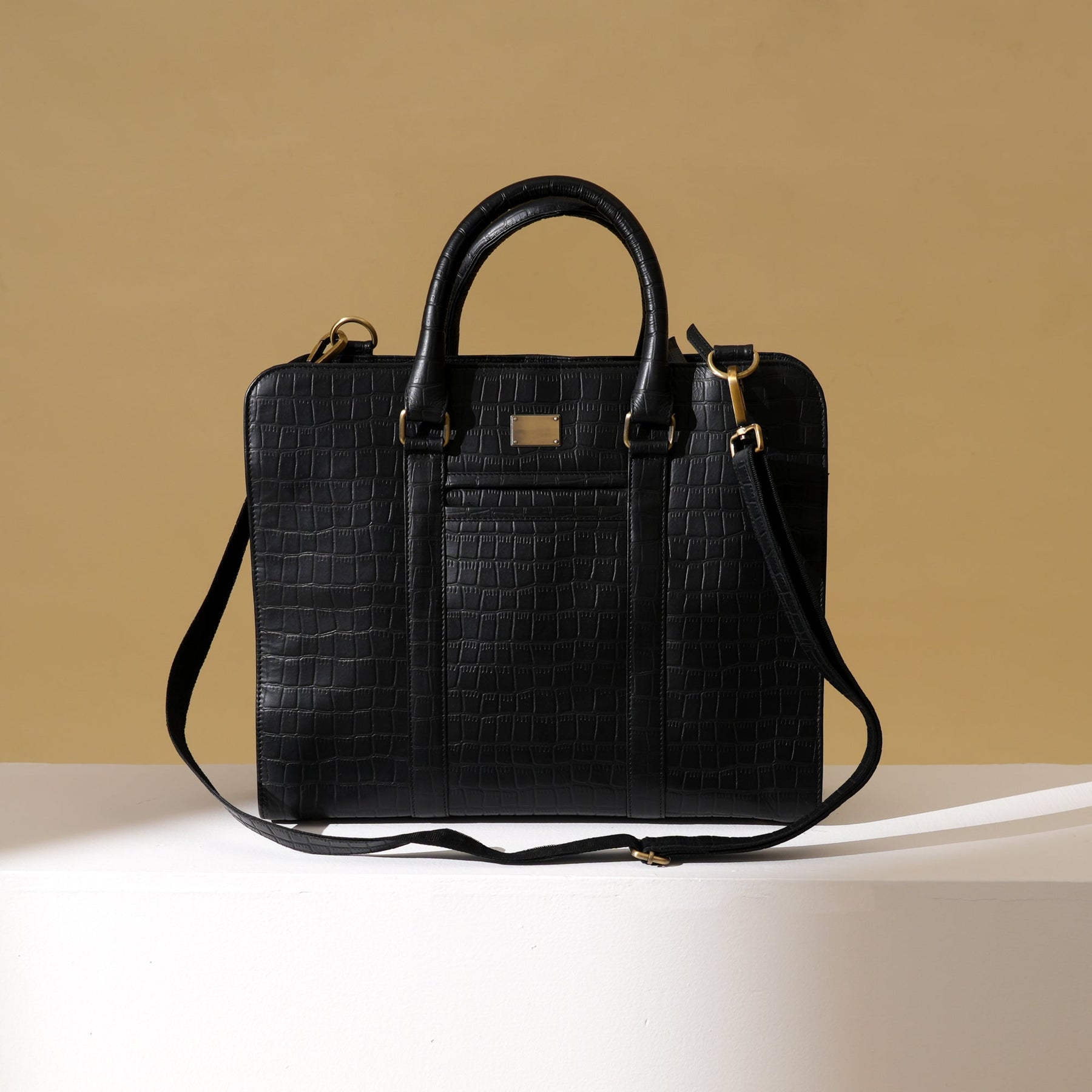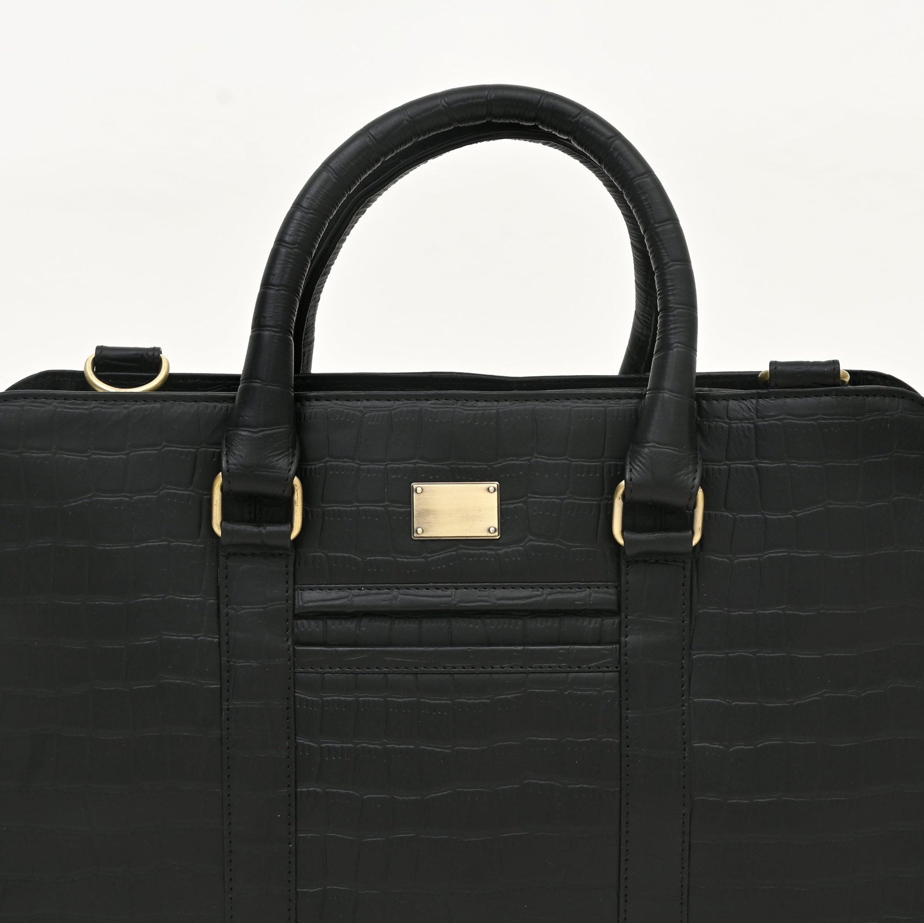 Expertly crafted from premium full-grain black croc-look leather, this bag exudes sophistication, strength, and timeless elegance. The rich, natural texture of the leather develops a beautiful patina over time, showcasing true craftsmanship and lasting quality. Designed for modern professionals, it features two spacious main zip compartments with durable metal YKK zippers, a padded sleeve for your laptop, and a large pocket for files. The detachable strap allows you to attach the bag conveniently to a suitcase trolley handle for effortless travel. With multiple organizers  including one internal zip pocket and two open slip pockets and an external open pocket for quick access to essentials, this bag perfectly combines luxury, utility, and modern functionality.