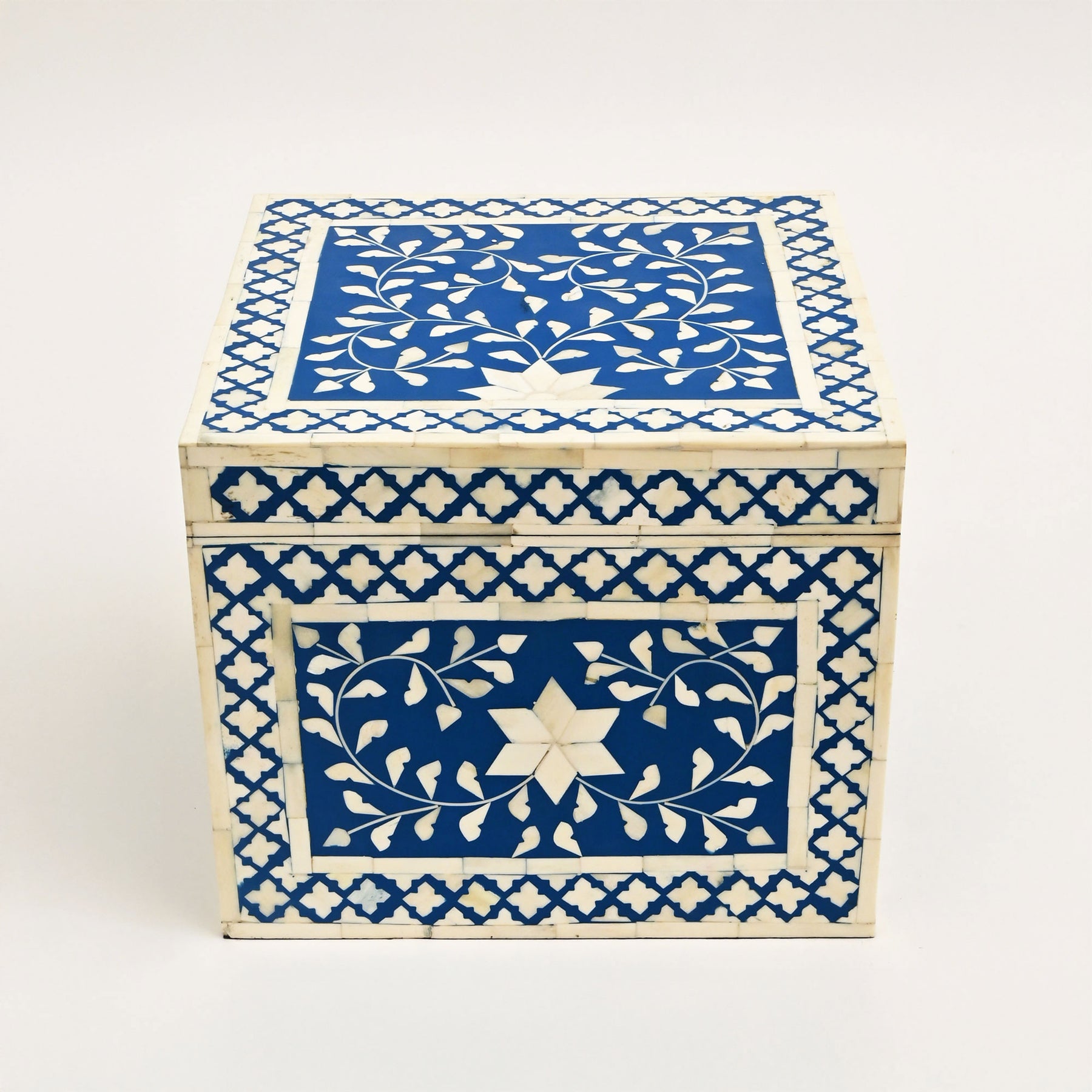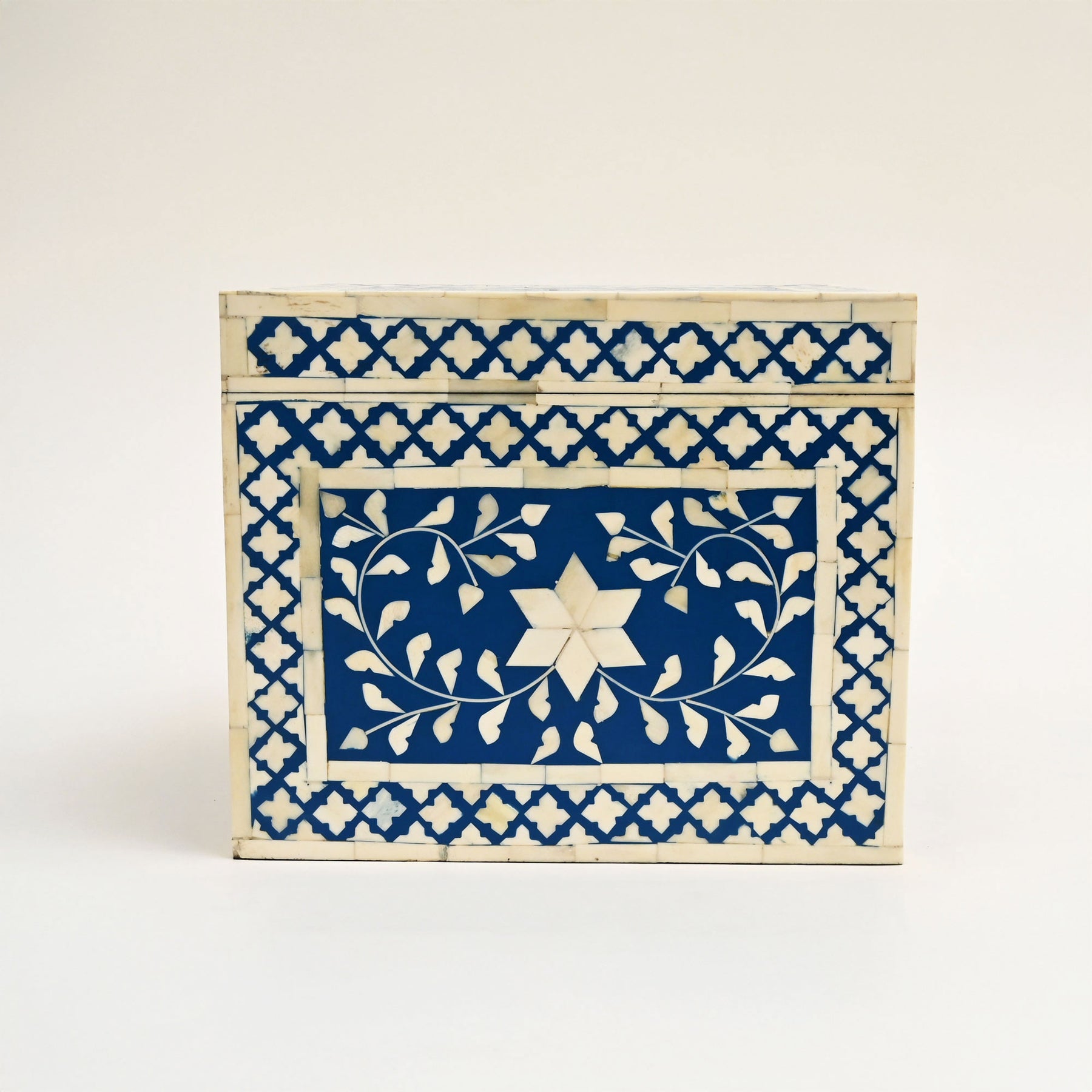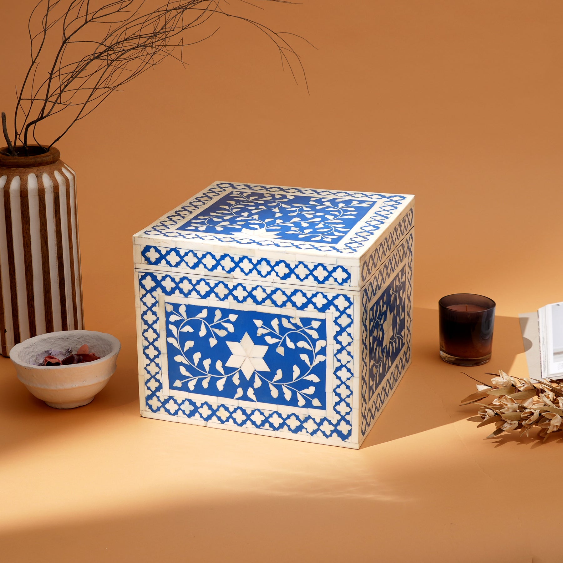 Infondi la tua casa con un'eleganza senza tempo e un'arte tradizionale con la Floral Bone Inlay Chest Box. Realizzato a mano da artigiani esperti, questo pezzo squisito presenta un delicato motivo floreale realizzato con ossa e resina provenienti da fonti etiche, accuratamente intarsiato su una solida struttura in legno. Progettato con un interno spazioso, è perfetto per conservare gioielli, accessori, documenti o ricordi. Il coperchio con cerniera consente un facile accesso garantendo al contempo una chiusura sicura. Con i suoi toni morbidi e neutri e la lavorazione intricata, questo baule funge sia da soluzione di stoccaggio funzionale sia da pezzo decorativo, rendendolo ideale per l'uso quotidiano o per proteggere tesori speciali.