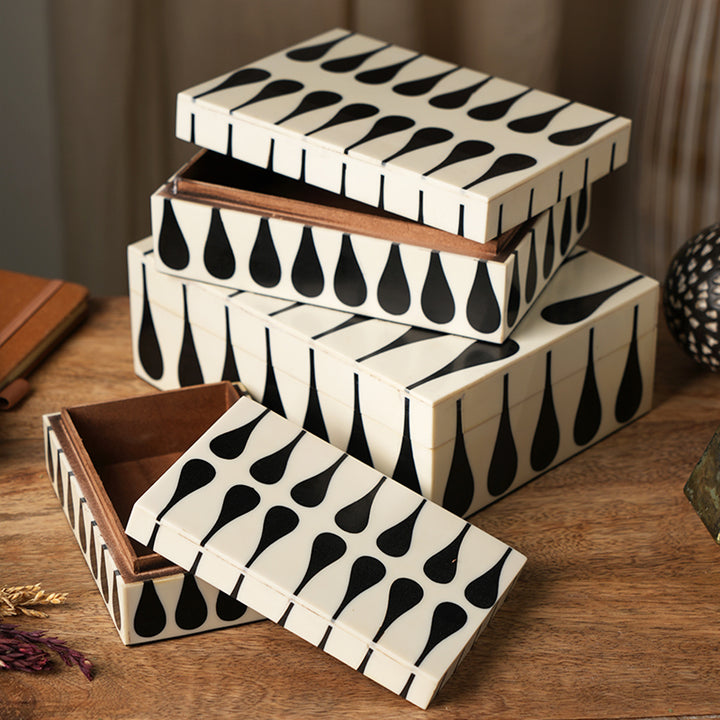 Organiseer met stijl met deze set van 3 zwart-wit patroon decoratieve harsdozen. Met een strak en eigentijds ontwerp bieden deze elegante dozen een praktische maar stijlvolle manier om je essentials op te bergen en tegelijkertijd de inrichting van elke kamer te verbeteren.