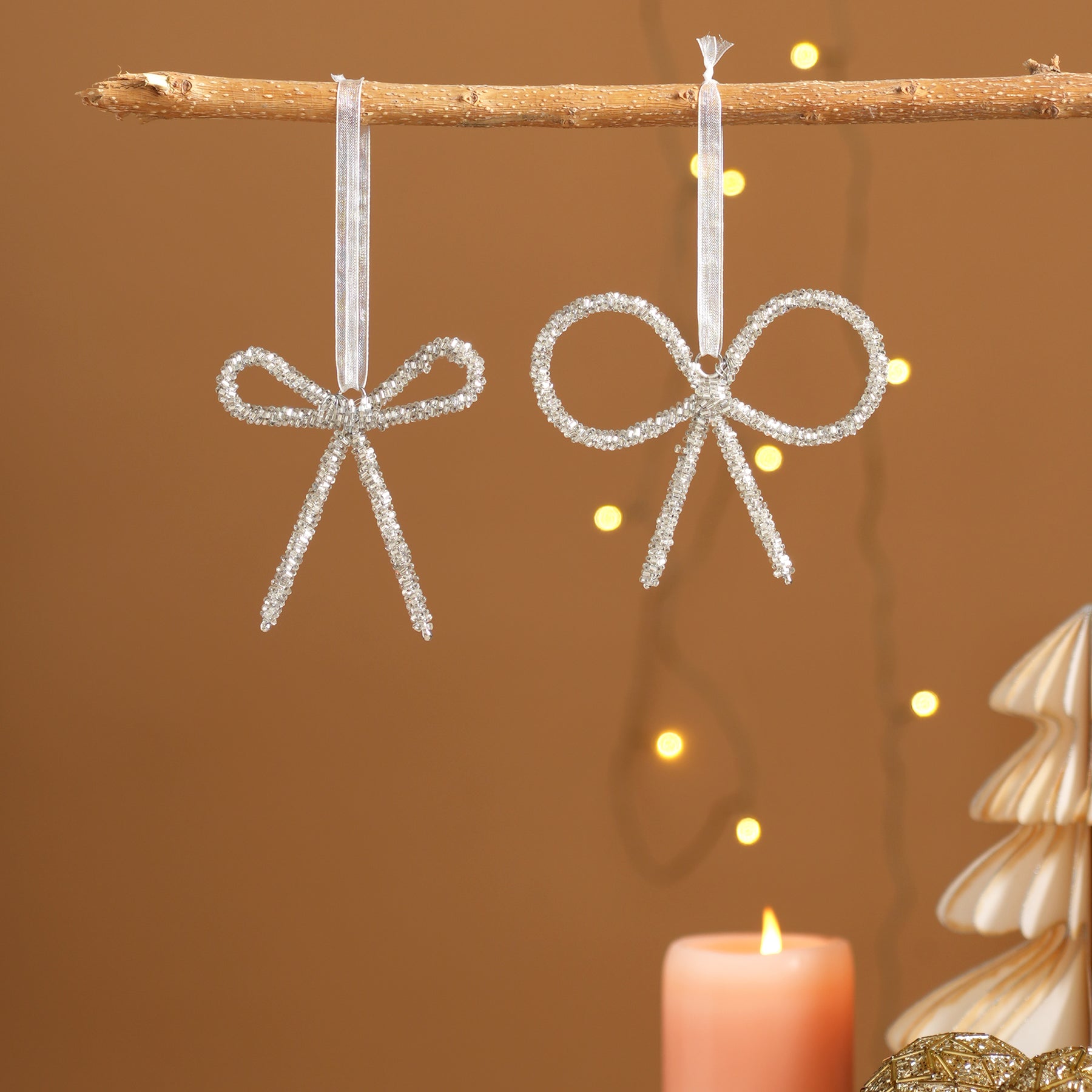 This large silver beaded bow hanging ornament adds a refined and elegant touch to Christmas décor. Crafted from aluminium and finished with shimmering bead details, it offers a beautiful balance of structure and sparkle.