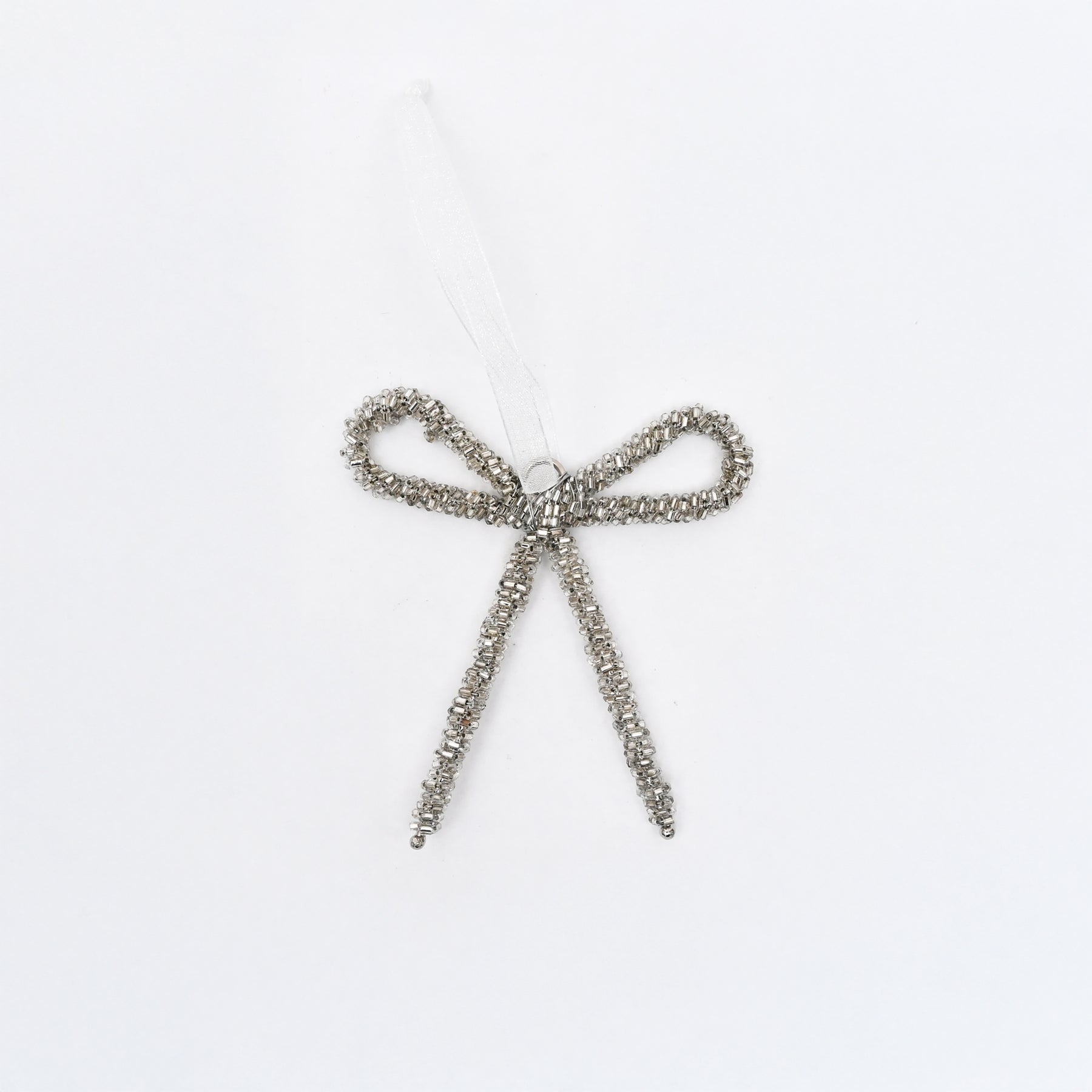 Silver Beaded Bow Hanging Ornament - 10 cm
