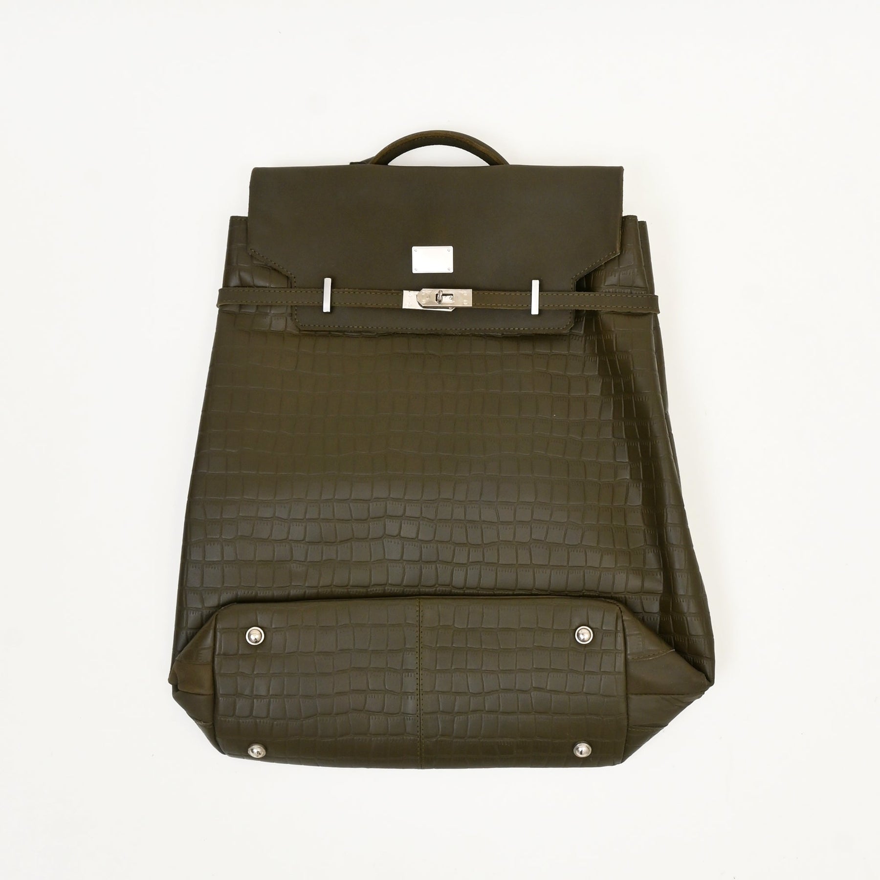 Crafted from premium full-grain green napa and croc-look leather, this backpack embodies sophistication, durability, and modern functionality. The rich leather texture develops a natural patina over time, showcasing true craftsmanship and luxury appeal. Designed for professionals and travelers, it features one spacious main compartment with a padded laptop pocket, one internal zipper pocket, and open slip-in pockets for seamless organization. The magnetic main closure with a flap and twist-lock ensures secure yet effortless access. For added comfort, it includes adjustable padded shoulder straps, an external zipper pocket for quick-access essentials, and a removable trolley sleeve attachment, making it a travel-ready companion that combines style, convenience, and performance.