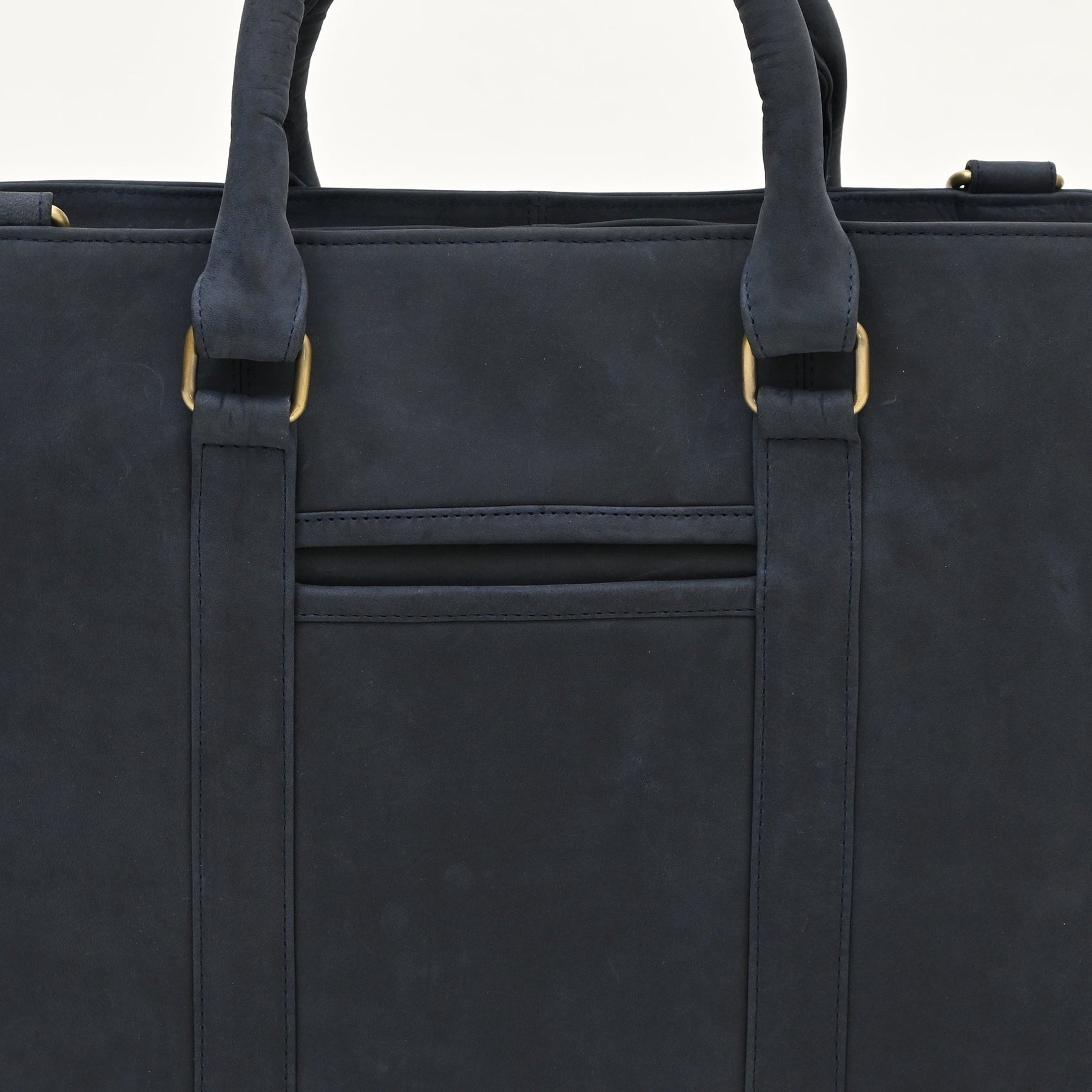 Expertly crafted from premium full-grain oily blue leather, this bag exudes sophistication and long-lasting durability. The rich, natural texture of the leather develops a beautiful patina over time, highlighting true craftsmanship and quality. Designed for modern professionals, it features two spacious main zip compartments with durable metal YKK zippers, a padded sleeve for your laptop, and a large pocket for files. The detachable strap allows the bag to be conveniently attached to a suitcase trolley handle for effortless travel. Multiple organizers including one internal zip pocket and two open slip pockets along with an outside open pocket for quick access to essentials, make this the perfect blend of style, functionality, and practicality.